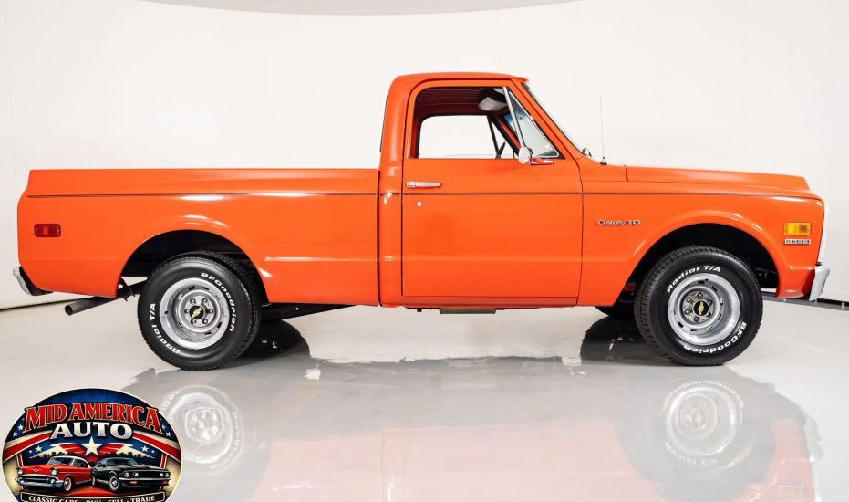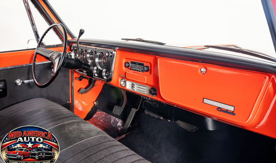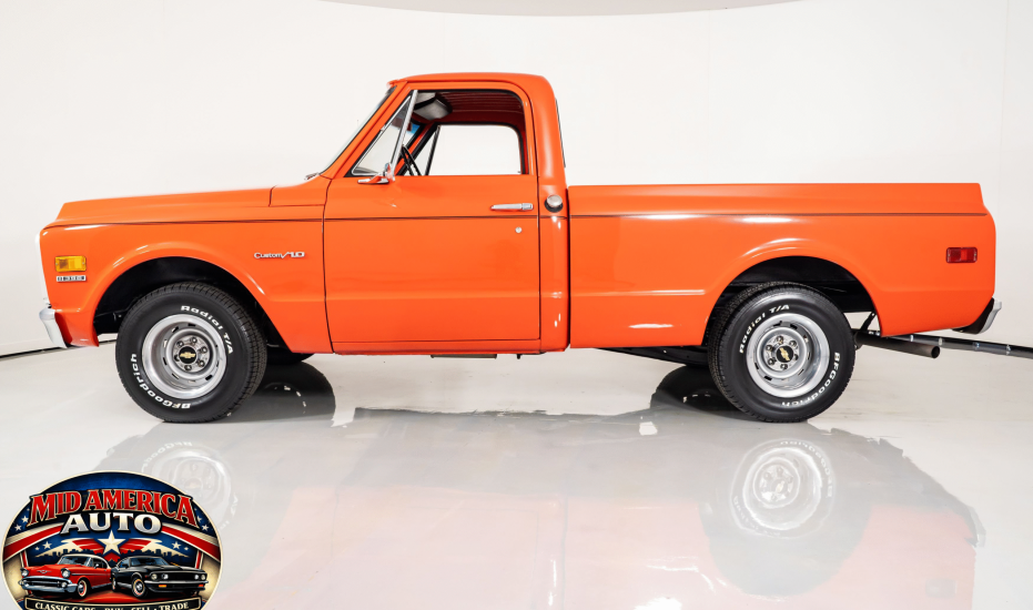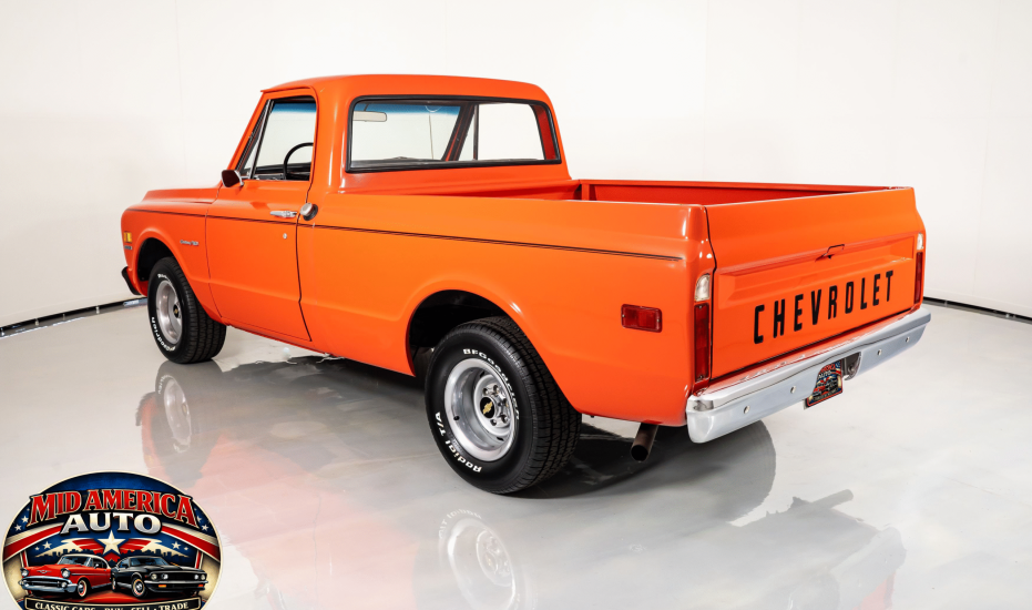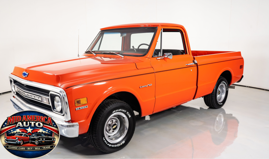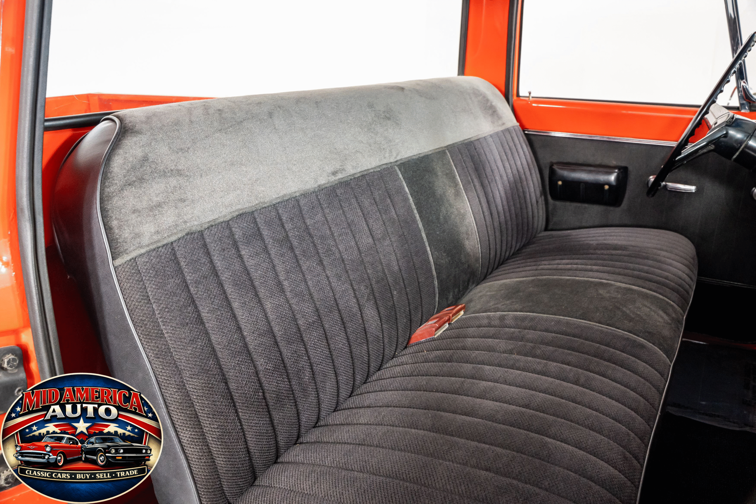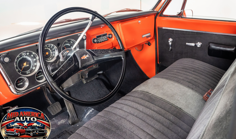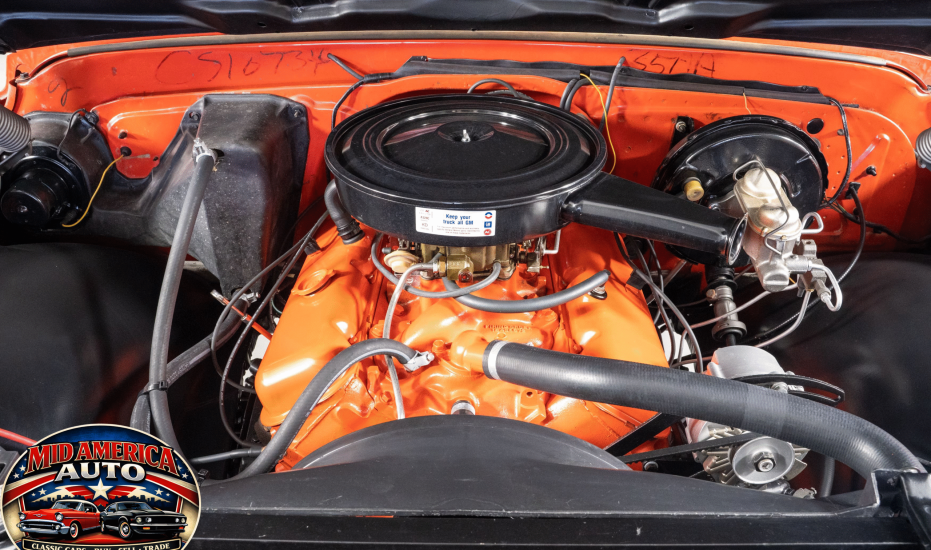Classic short-bed pickup with a big-block V8 and automatic transmission. Finished in vibrant orange with a black bench seat interior. Features power steering and brakes, upgraded wheels and tires, and a fresh interior. A beautifully restored truck with strong presence and performance.