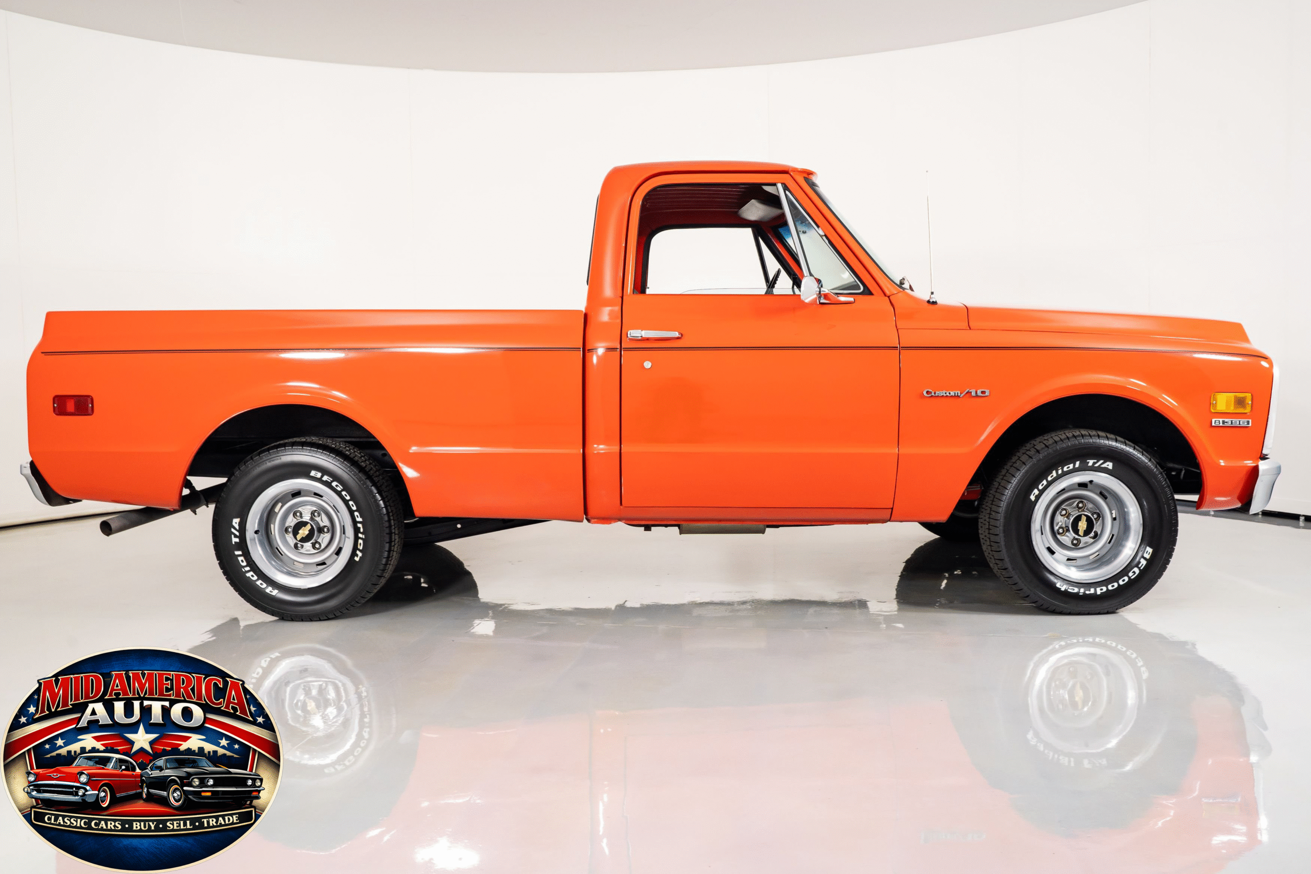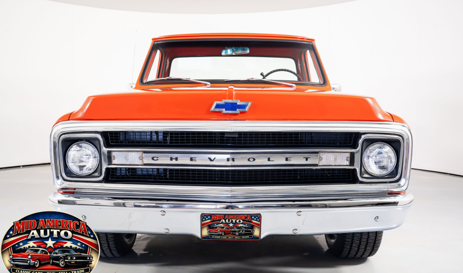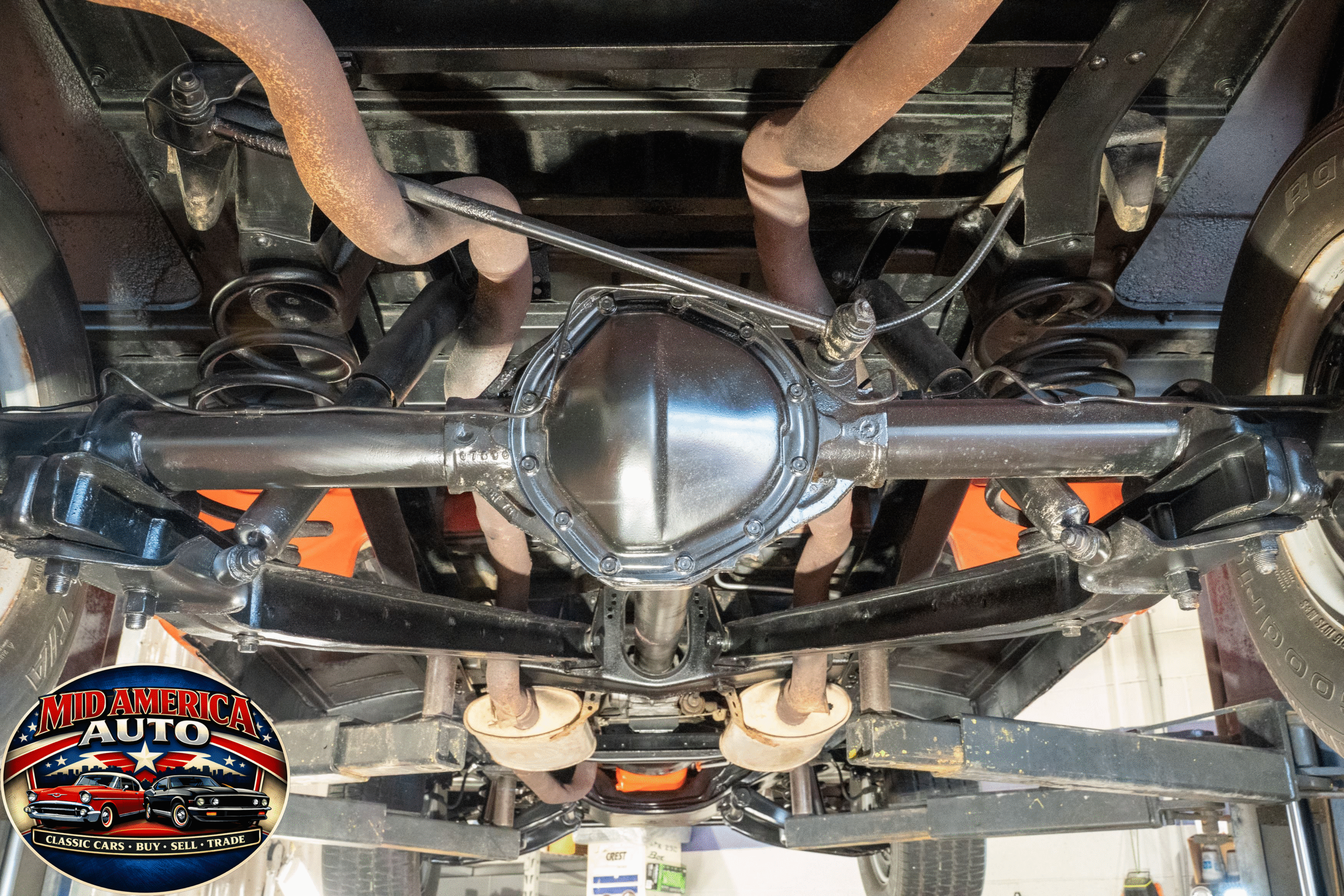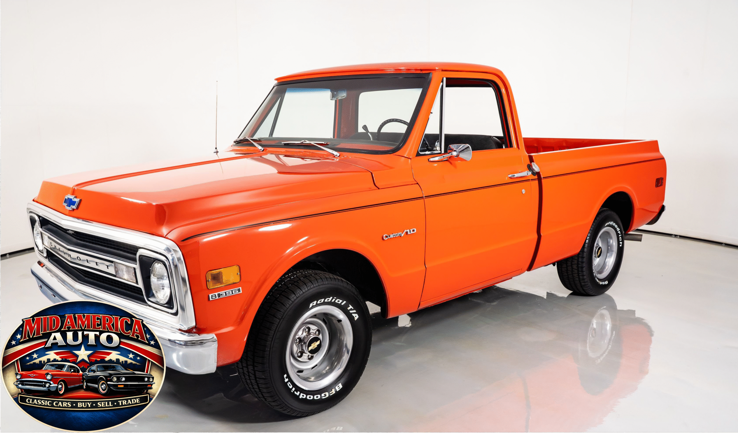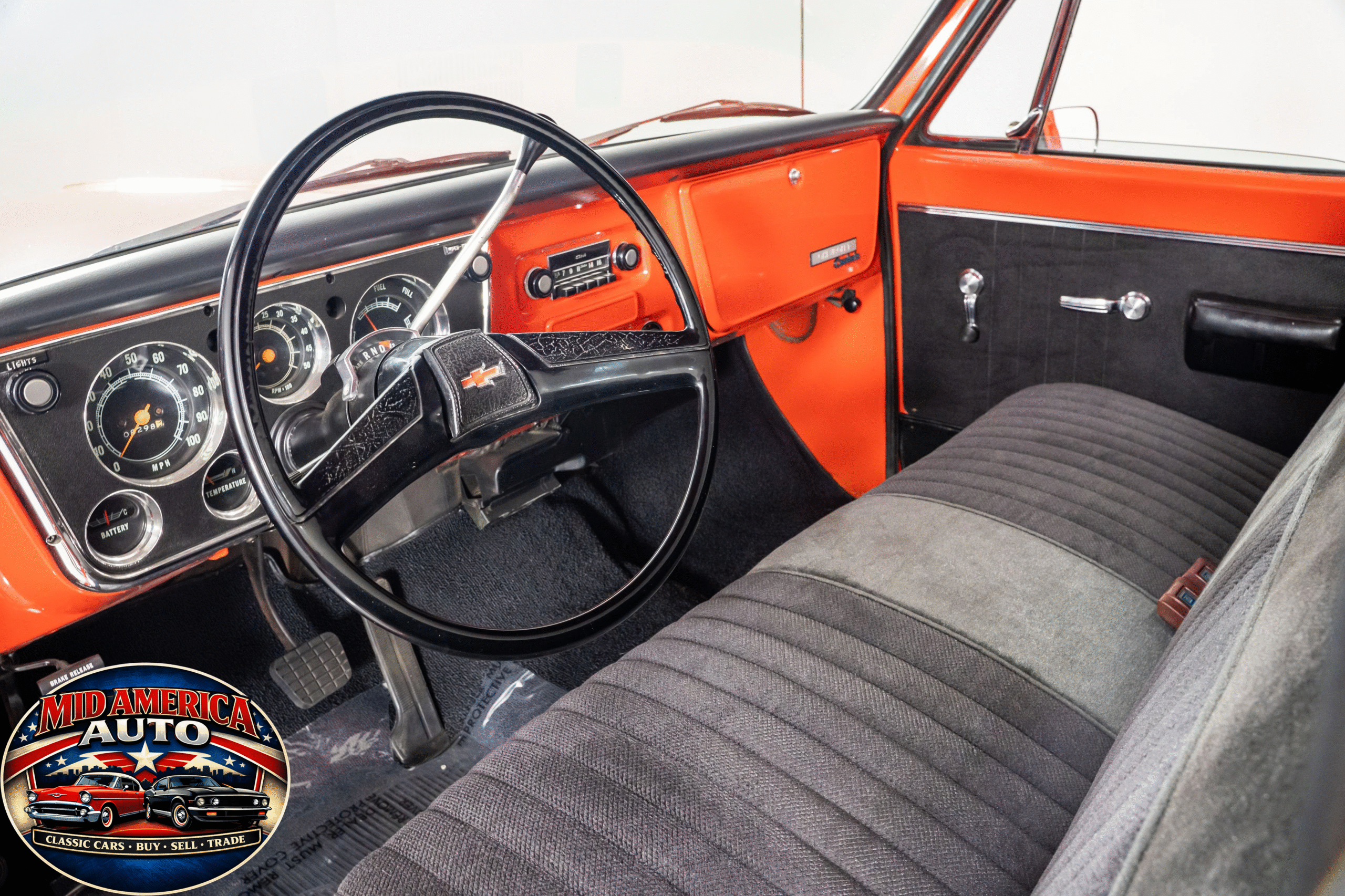 Classic short-bed pickup with a big-block V8 and automatic transmission. Finished in vibrant orange with a black bench seat interior. Features power steering and brakes, upgraded wheels and tires, and a fresh interior. A beautifully restored truck with strong presence and performance.