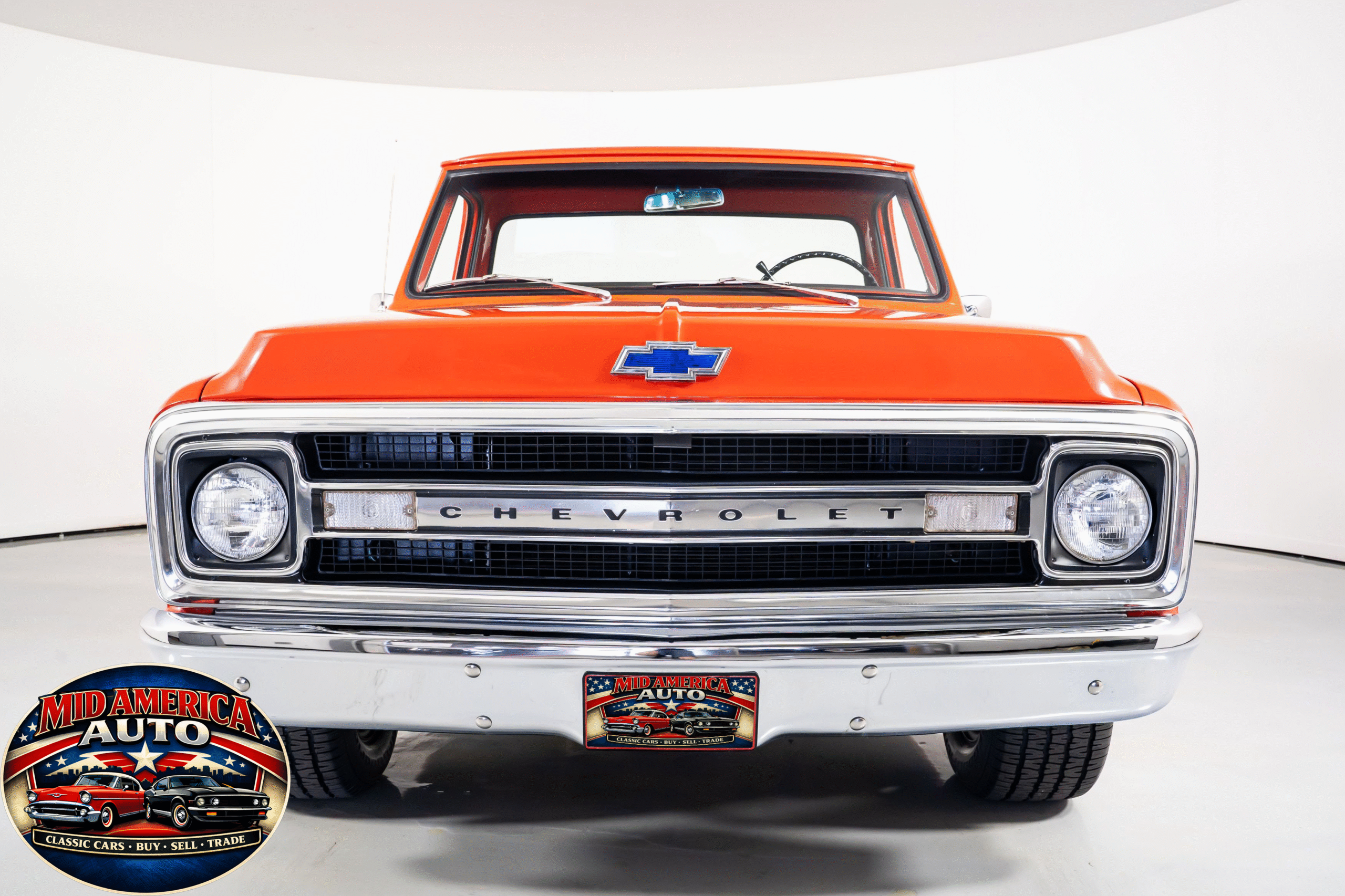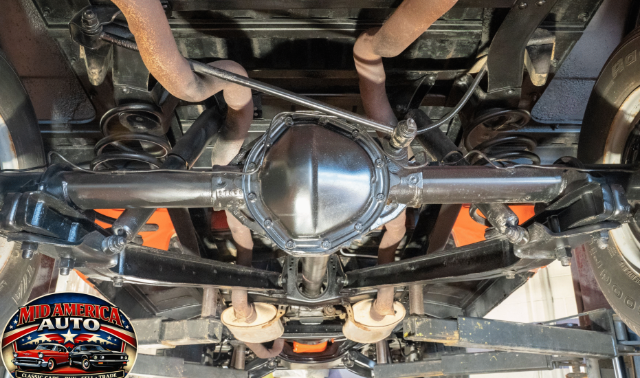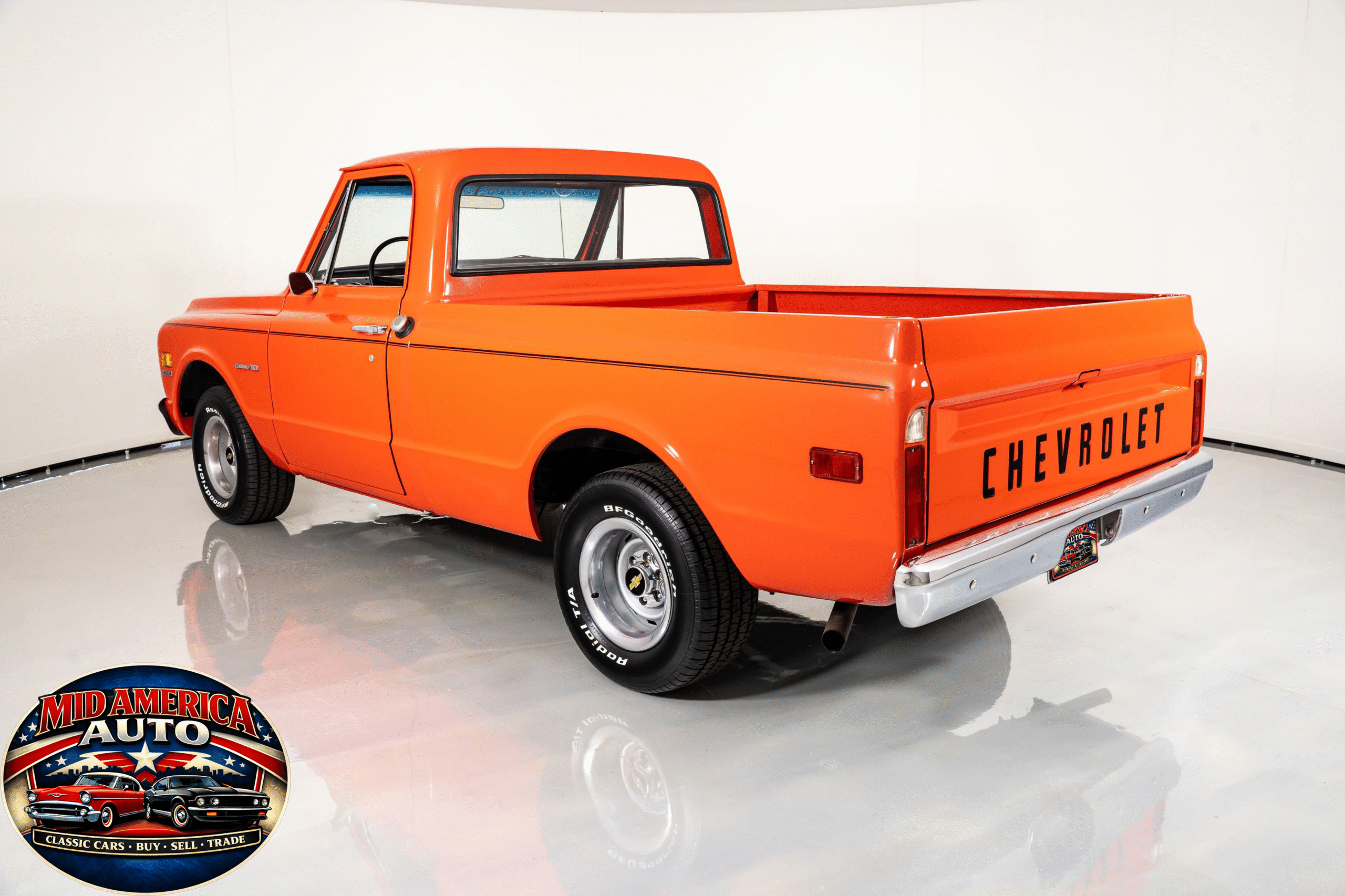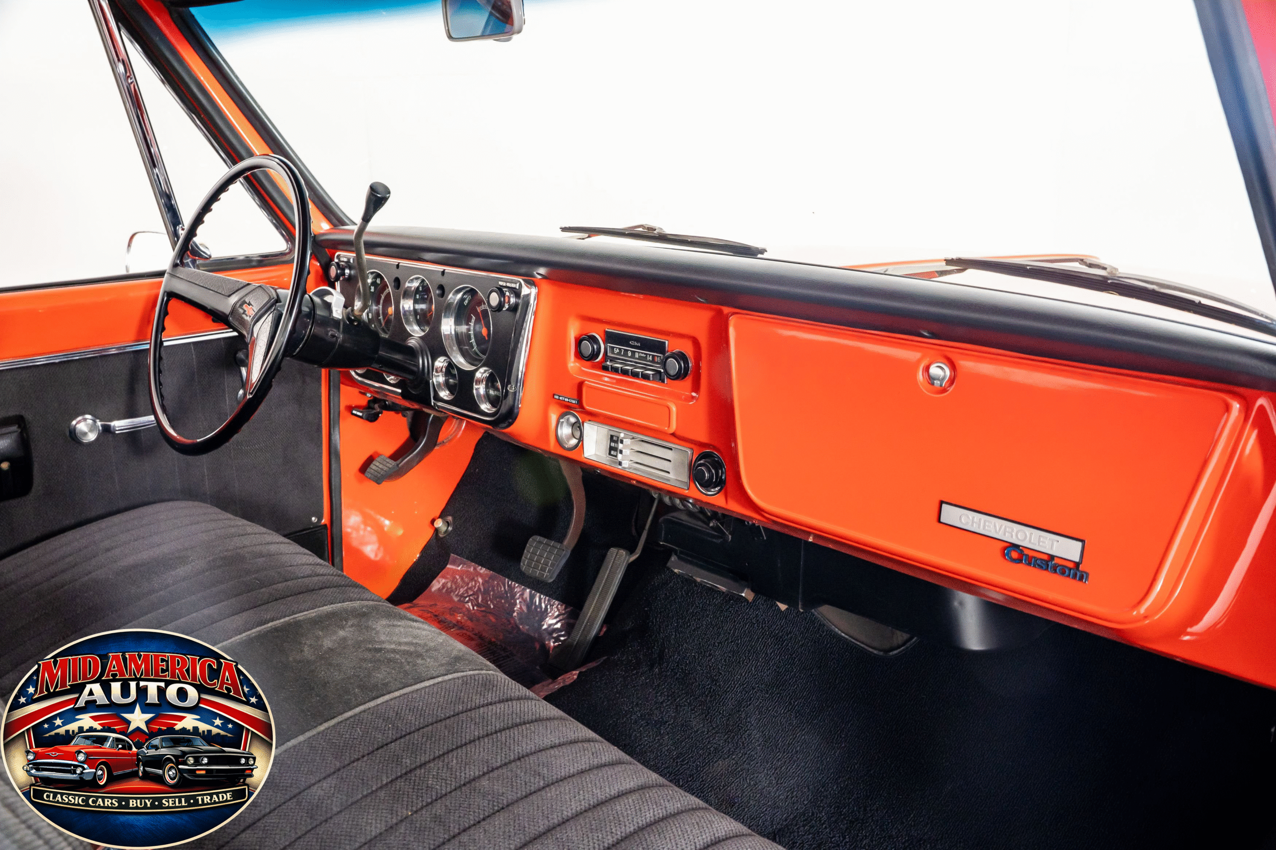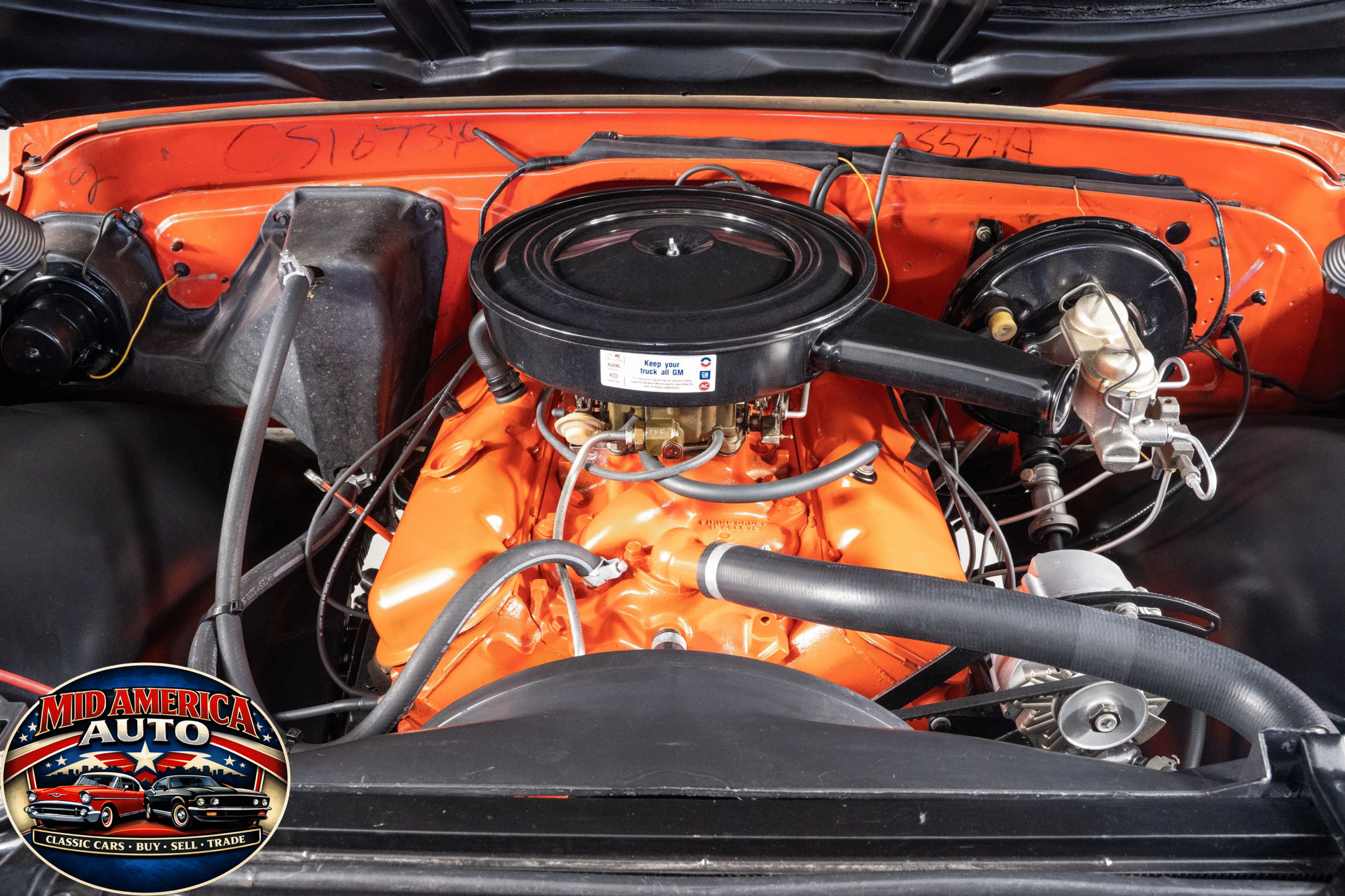 Classic short-bed pickup with a big-block V8 and automatic transmission. Finished in vibrant orange with a black bench seat interior. Features power steering and brakes, upgraded wheels and tires, and a fresh interior. A beautifully restored truck with strong presence and performance.